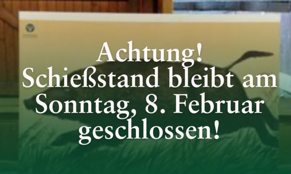 Bitte beachten: Der Schießstand ist am 08.02. geschlossen. Aufgrund von Aufräumarbeiten im Anschluss an die Standputzete ist kein Betrieb möglich.